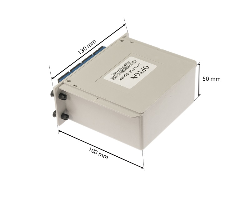 1x16 optical splitter (one input, sixteen outputs) with symmetrical power distribution (6.25% on each output). It is closed in a cartridge housing, the inputs and outputs are already connected to the adapters. The offered product has SC / UPC connectors.